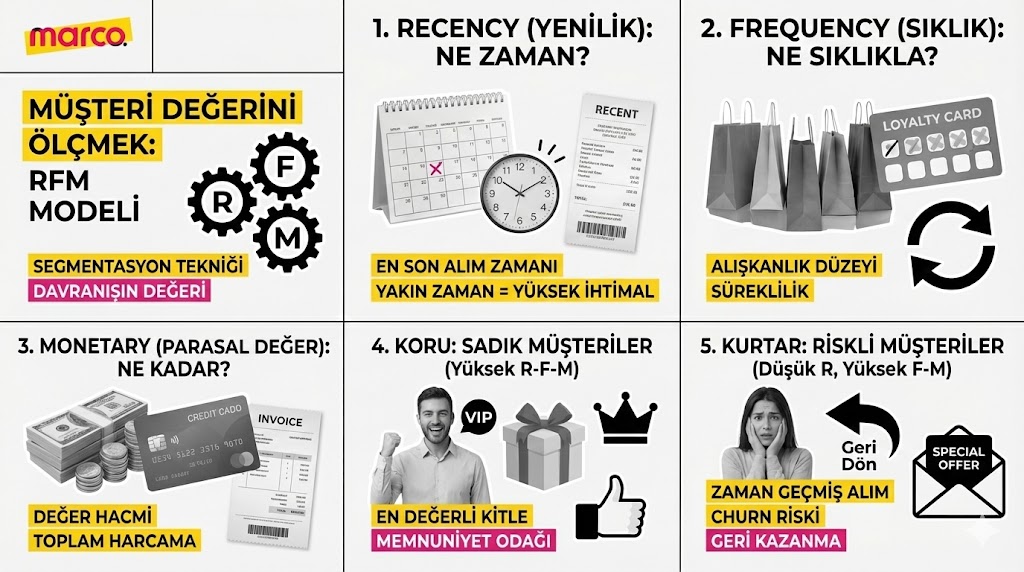 RFM Modeli; müşterileri en son ne zaman (Recency), ne sıklıkla (Frequency) ve ne kadar (Monetary) alışveriş yaptıklarına göre puanlayan bir segmentasyon tekniğidir.